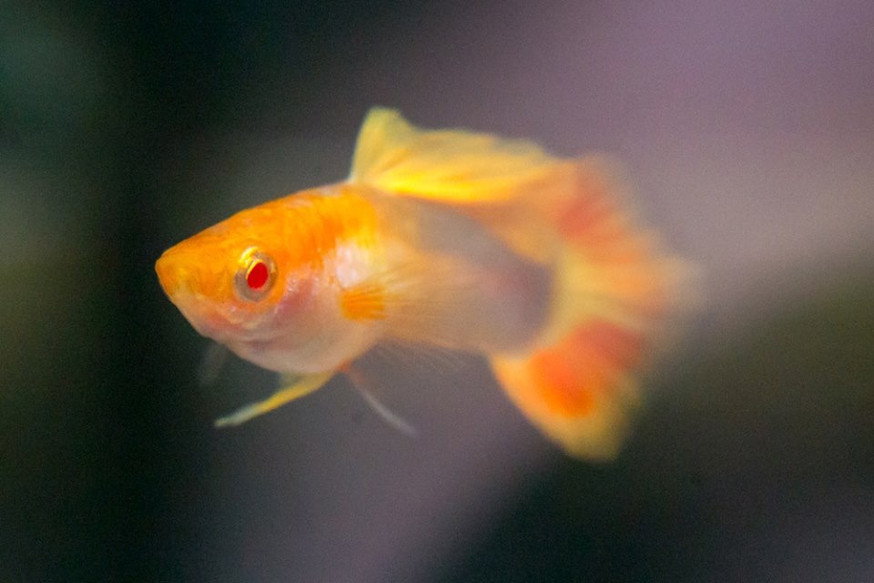 Aus der amerikanischen Literatur war zu entnehmen, dass in den USA auch eine albinotische Guppyform aufgetaucht war. Sie ist gekennzeichnet durch das Fehlen der Augenpigmente, so dass die Augen nicht schwarz aussehen, sondern bei Lichteinfall rot aufleuchten. Sonst ähnelt sie dem Goldguppy. Gordon berichtet, dass die ersten vereinzelten Guppys im Jahre 1940 bei ihm aufgetreten seien, und zwar in einem grauen Superbastamm, dessen Elterntiere ihm Dr. Abbs überlassen hatte. Dr. Schmidt berichtete im Rundbrief der DGG Nr. 3/1956: Albinotische Guppys traten zuerst in Amerika auf (eine Mutation), und ich glaube, dass diese Tiere wegen ihrer auffallend goldenen Farbe viele Anhänger finden werden.' (Kotsch, Guppybrief)